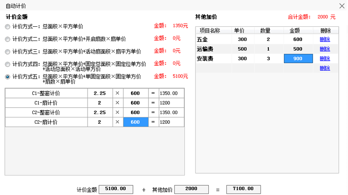系統(tǒng)預(yù)設(shè)5種門店常用的報價計價方案,用戶直接選擇輸入相應(yīng)的數(shù)據(jù)保存使用,設(shè)計下單時自動計算出該系列的報價