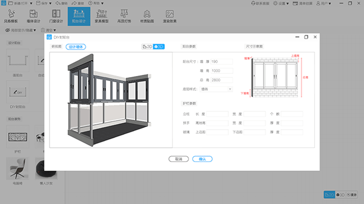 自動封陽臺,快速看效果,DIY封陽臺,定制專屬陽臺門窗參數(shù),參數(shù)化陽臺護(hù)欄、墻體,高度還原顧客家的陽臺樣式